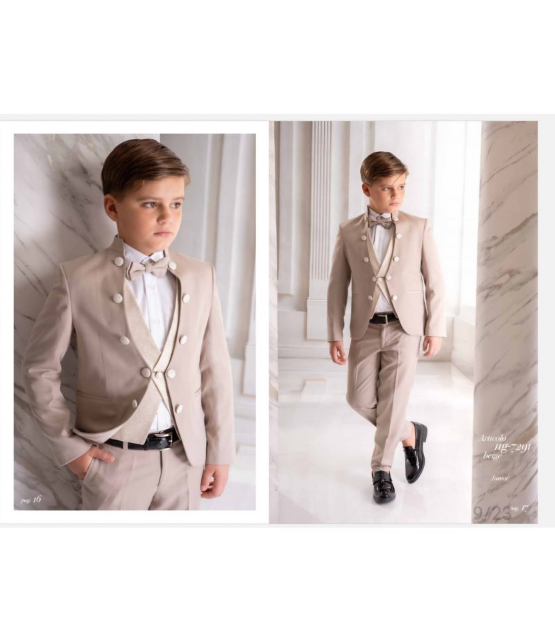 Modello principesco, giacca bordata di bottoni più panciotto e pantalone beige ,camicia bianca elasticizzata con papillon beige