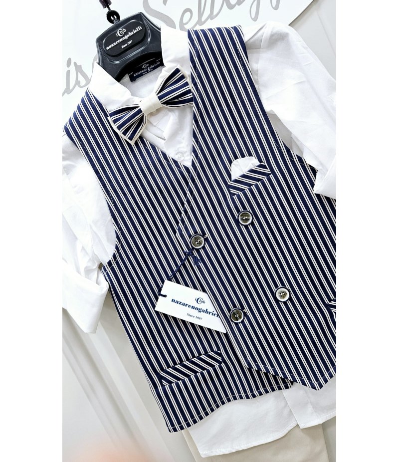 Composto Da Gilette a Righe Blu Beige Doppiopetto, Camicia con Manica Allungabile Papillon Rigato e Pantalone Con Molla In vita