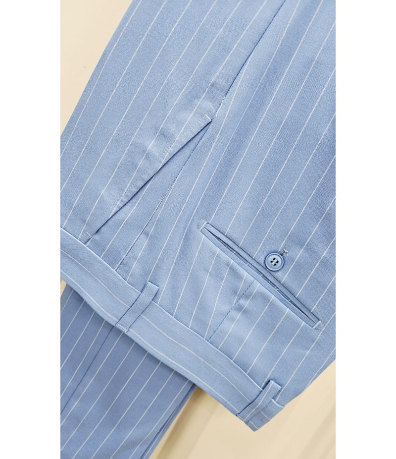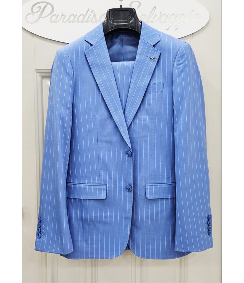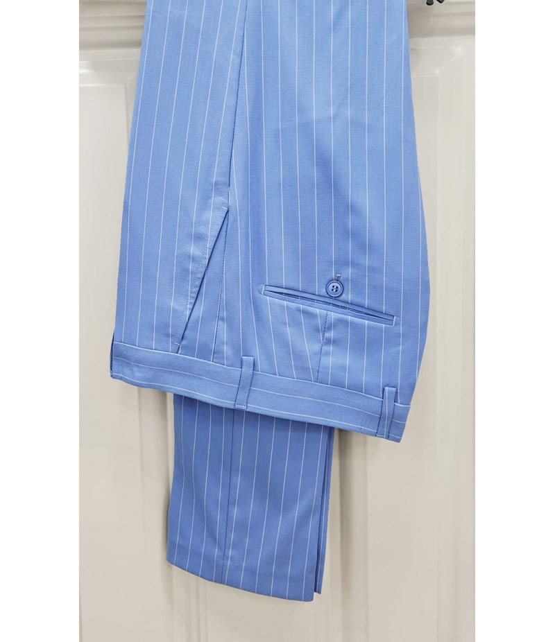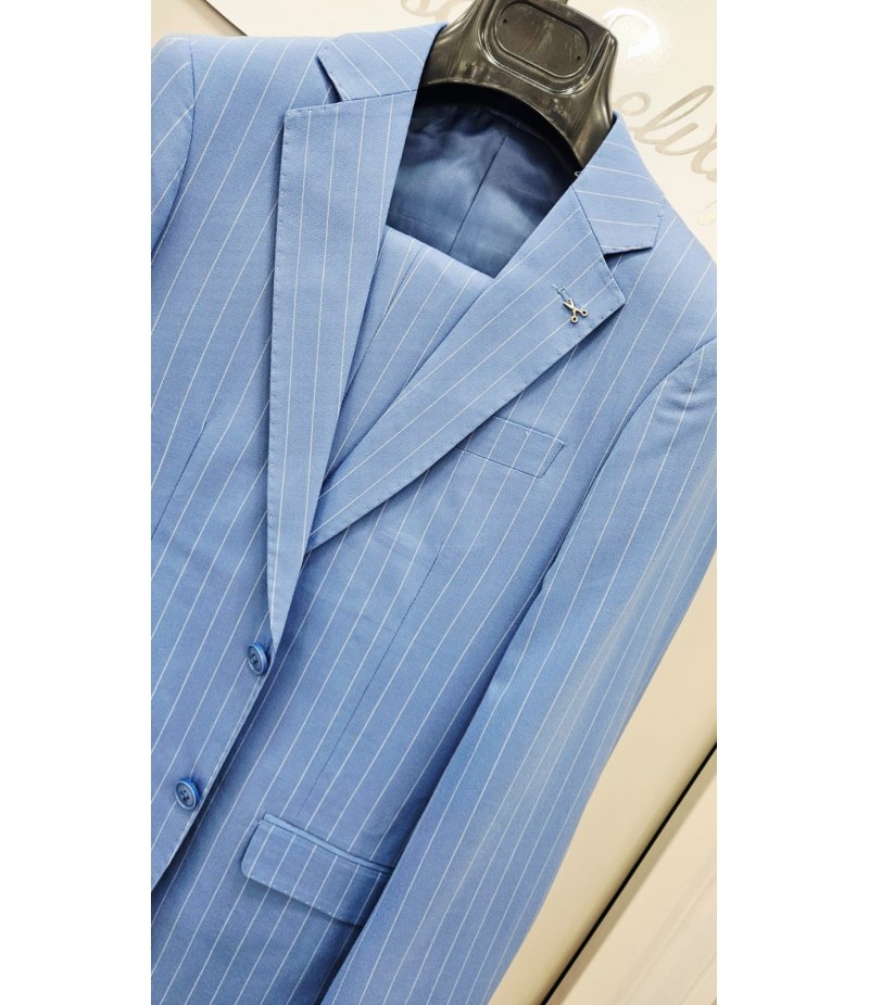 Abito elegante da uomo per cerimonia e 18° compleanno, caratterizzato da uno stile raffinato e moderno. Il colore celeste carico con motivo gessato dona all’outfit un aspetto elegante e distintivo, perfetto per eventi, feste e occasioni importanti.
