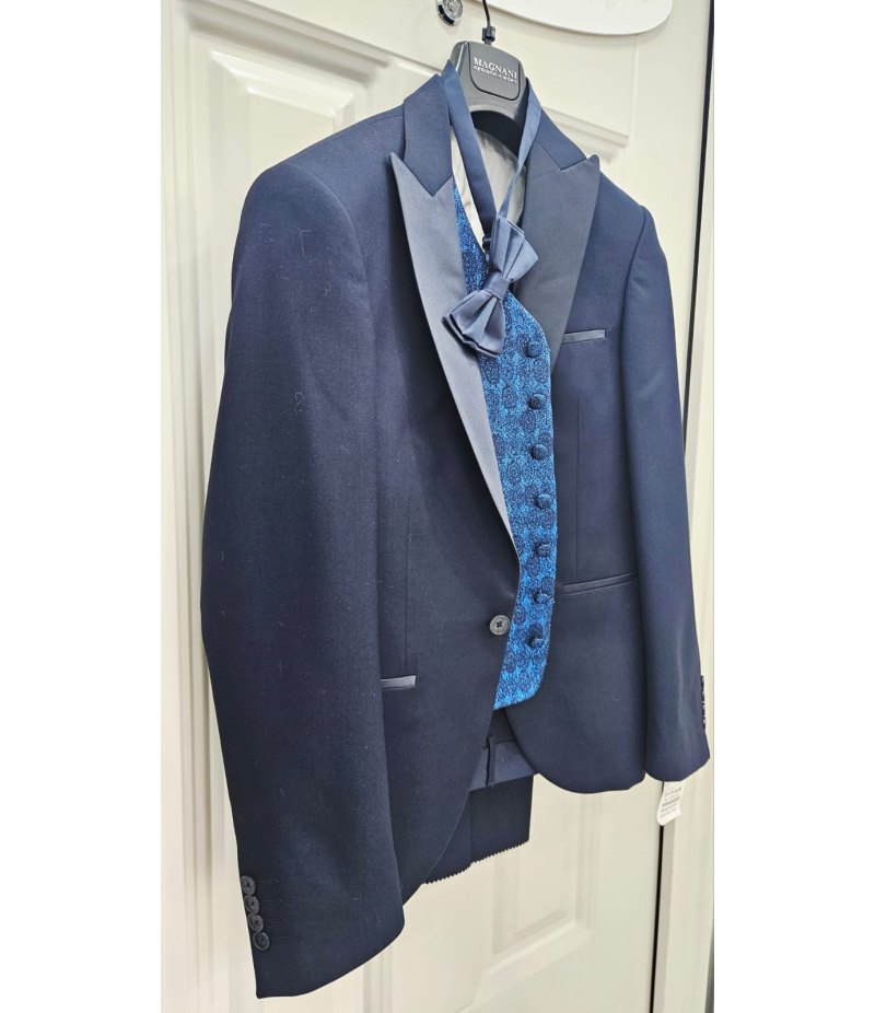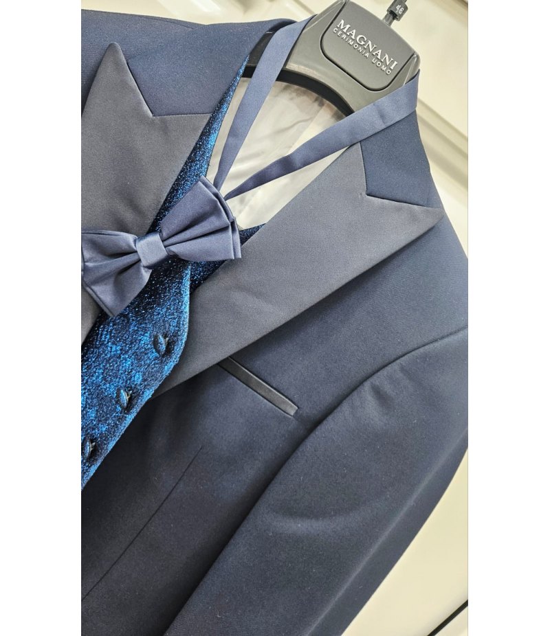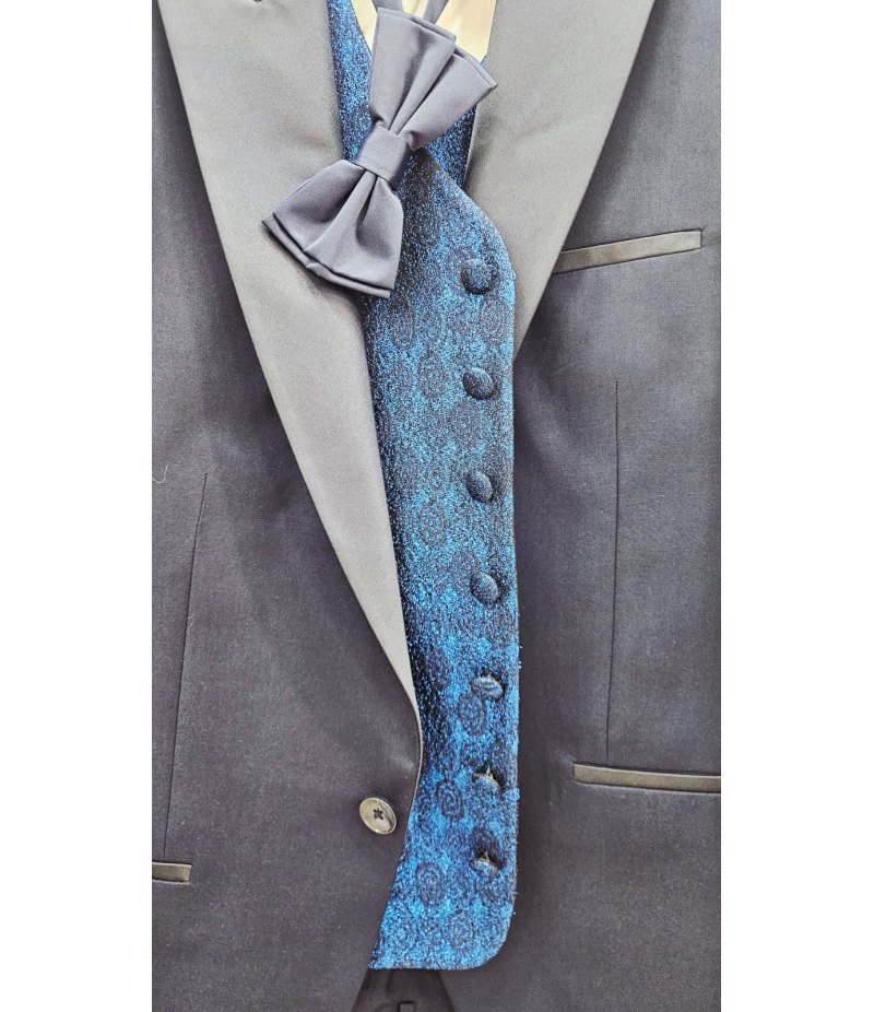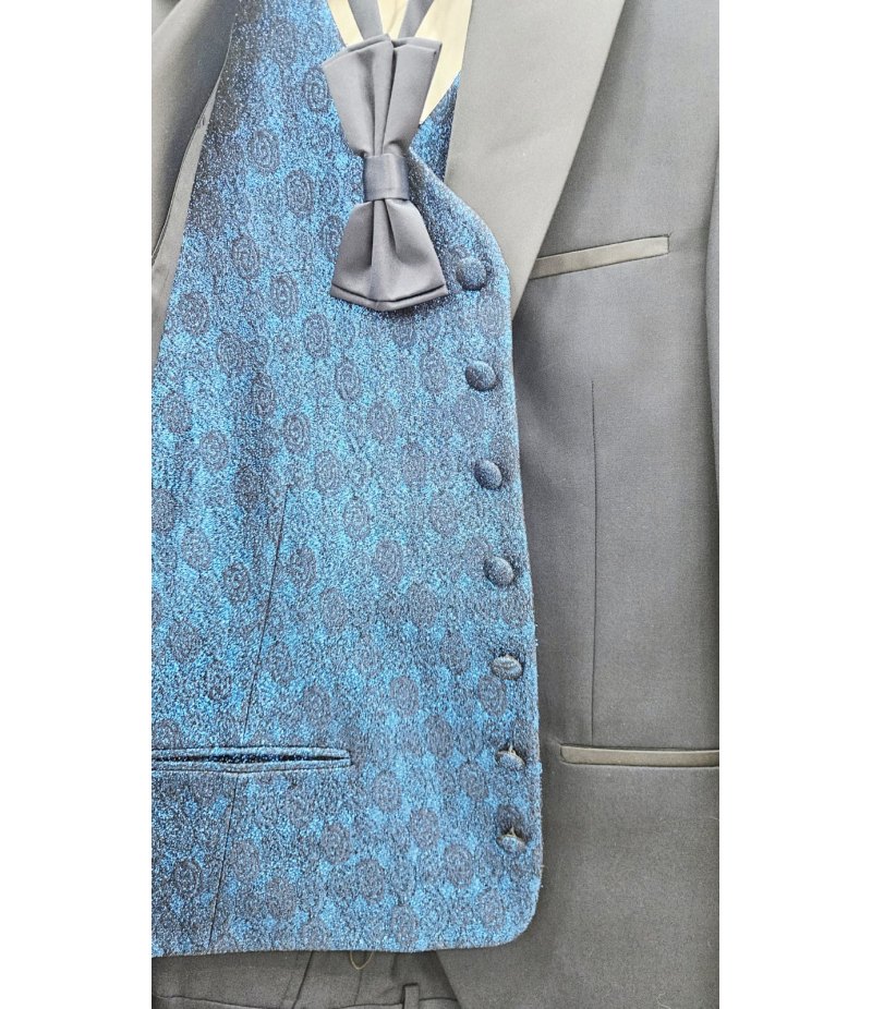 Il completo è composto da giacca elegante con collo a lancia rivestito in raso, pantalone coordinato, gilet damascato azzurro brillantinato con glitter e papillon blu abbinato. I profili in raso sulle tasche e sul taschino aggiungono ulteriore raffinatezza rendendo questo abito ideale per cerimonie, eventi eleganti e 18° compleanno.