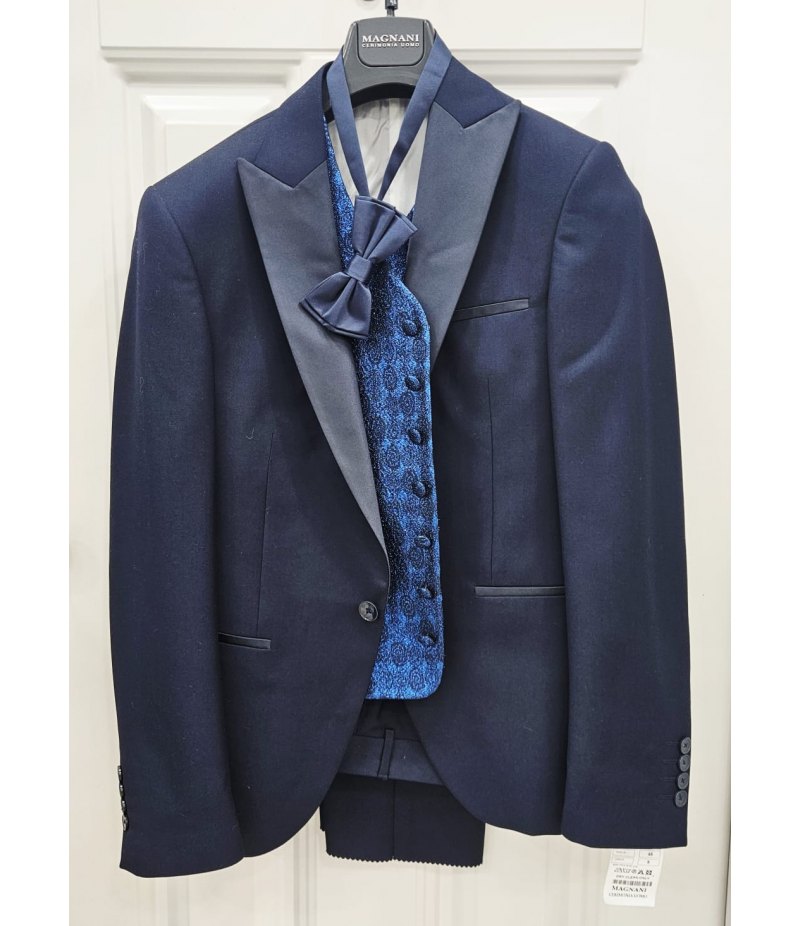 Elegante abito uomo da cerimonia e diciottesimo pensato per occasioni importanti in cui lo stile deve distinguersi. Il completo nel raffinato colore blu presenta una linea moderna e sartoriale, impreziosita da dettagli in raso semi lucido che valorizzano il taglio elegante della giacca.