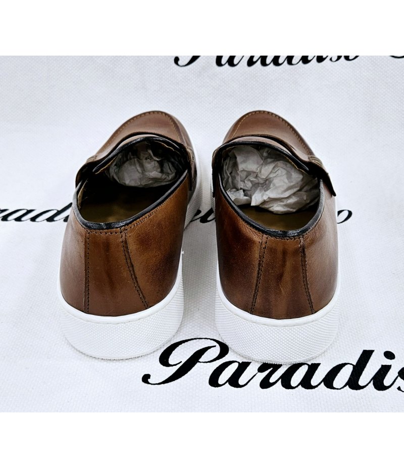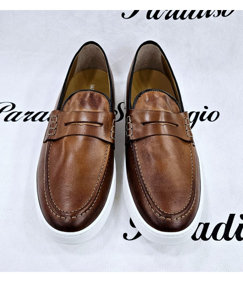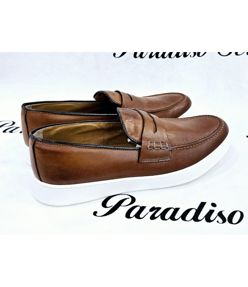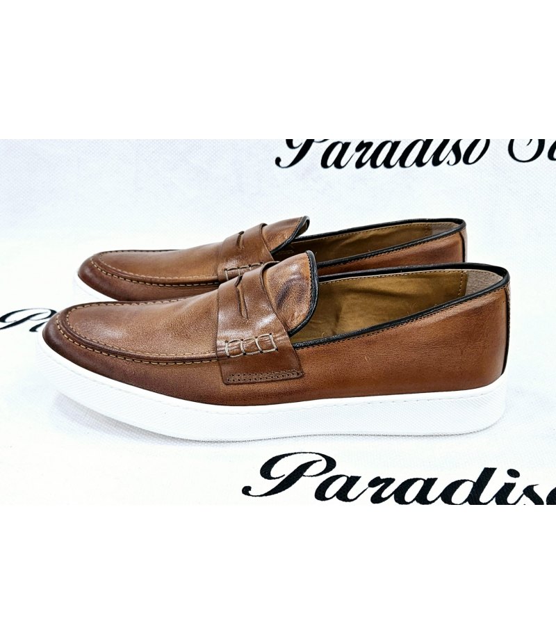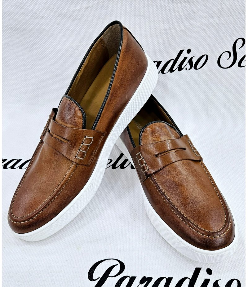 Mocassino Uomo In Pelle Con Gomma Bianca, Color Cuoio, Marca Manfredi