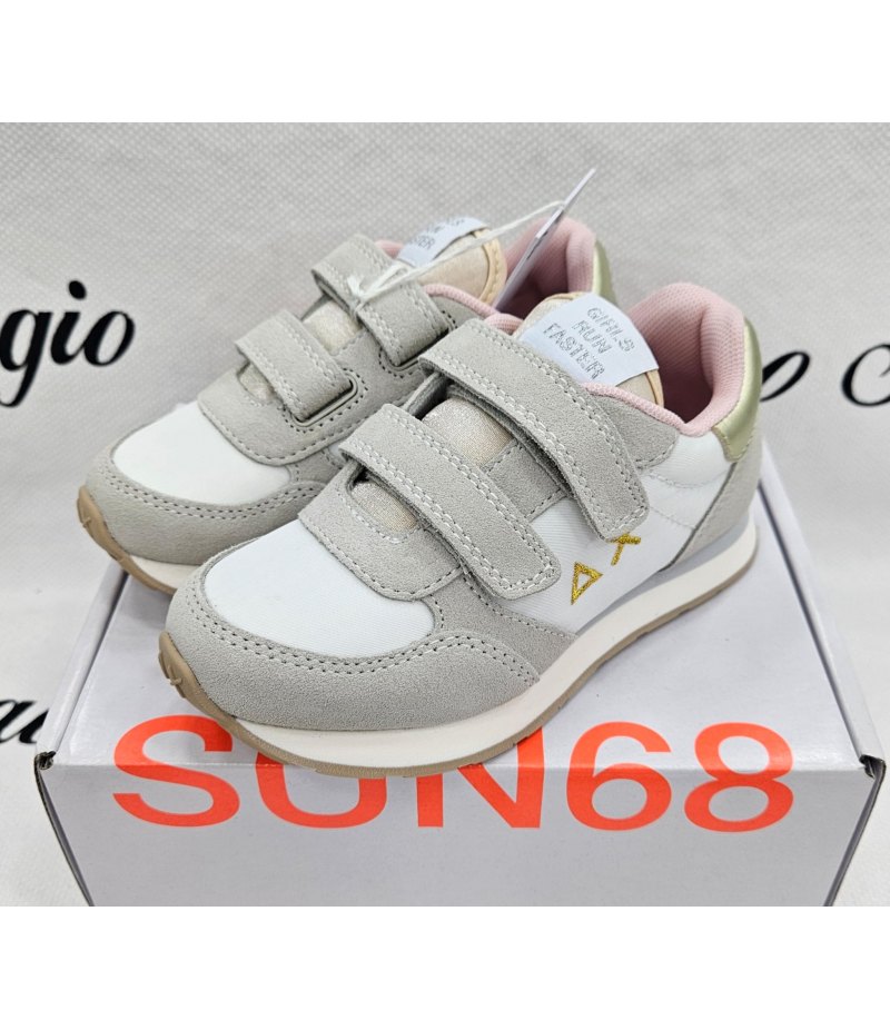Scarpe Sneakers da Bimba e Bambina, Colore Bianco, Beige e Rosa con Doppio Strappo Beige e Baffo Dorato Dietro, in Pelle e Tessuto, Suola in Poliuretano, marca Sun68.